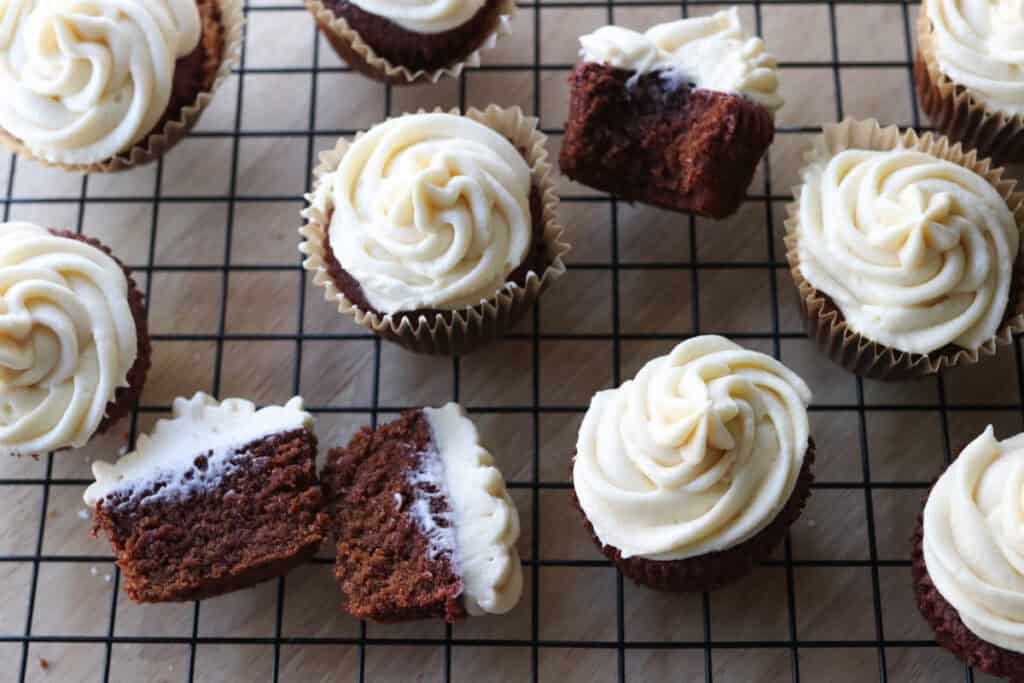 Buttermilk’s acidity adds moisture and tender crumb to the cupcakes, plus it reacts beautifully with the baking soda for lift. If you’re out of buttermilk, make homemade buttermilk by mixing regular milk with half a teaspoon of lemon juice or vinegar and letting it sit for five minutes.