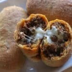 - Fill each pocket with 1-2 tablespoons of the meat mixture. Cut the cheese sticks in half, then place half of one on each pocket.