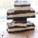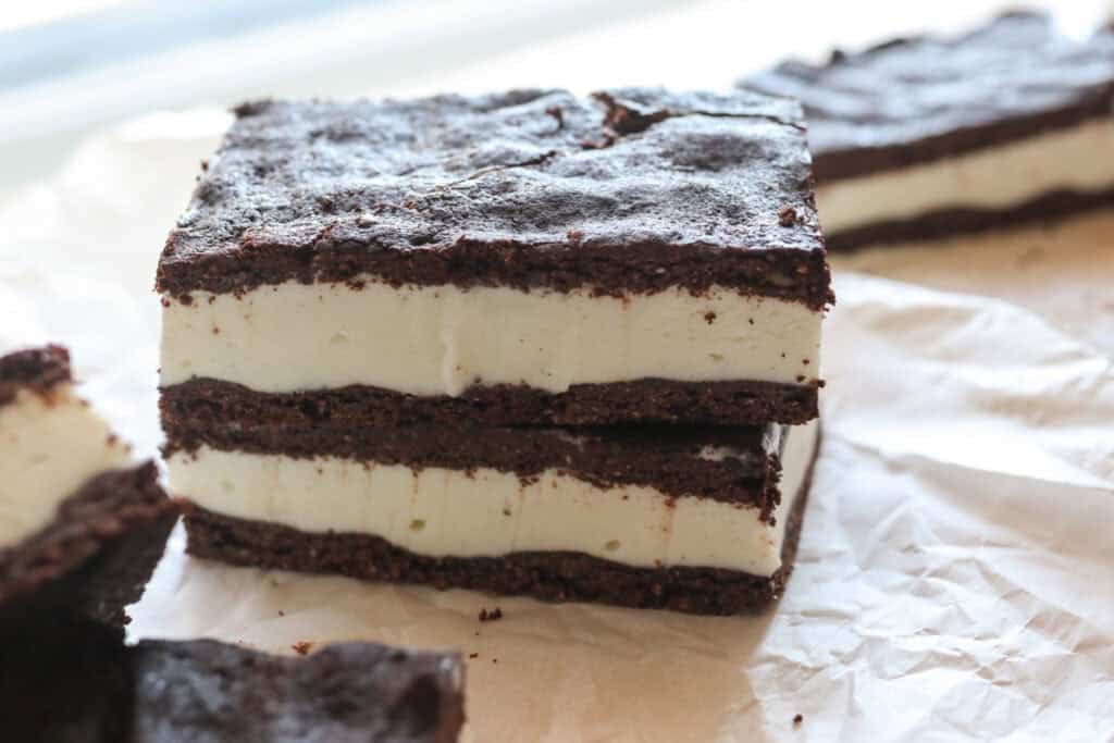 - Place back in the freezer for a few hours until frozen solid. Then, lift the bars from the pan using the parchment paper and cut into 12 equal sandwiches.